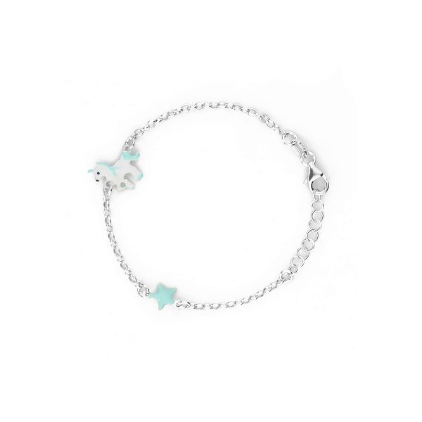 Bracciale realizzato in argento 925 arricchito da unicorno e stella smaltati. Regolabile grazie ad una serie di anellini terminali