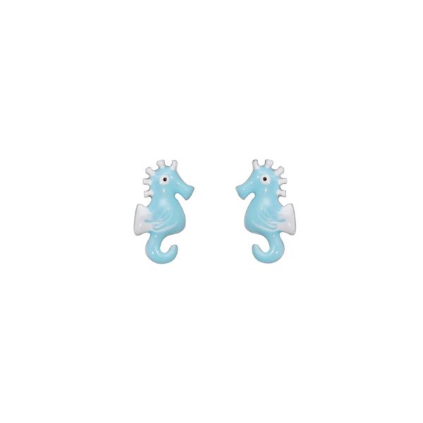 Orecchini della collezione ‘Kids’ di Chimiama Gioielli realizzati in argento 925 a forma di cavalluccio marino smaltato azzurro. Chiusura a farfallina