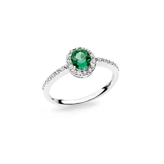 Questo anello della collezione ‘Colore’ è realizzato in oro bianco 750%. Vede come protagonista la pietra di colore verde, colore della speranza e del sogno. Impreziosita da numerosi zirconi di colore bianco rende l’anello unico e brillante