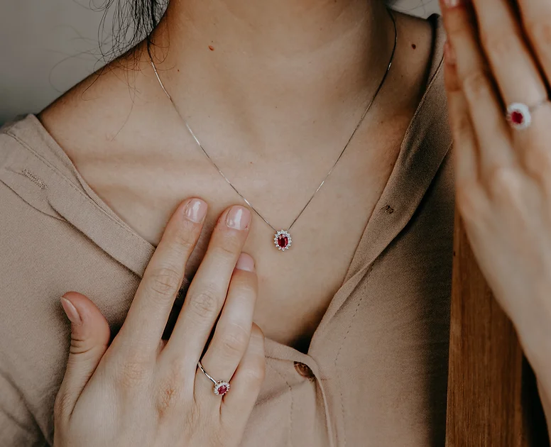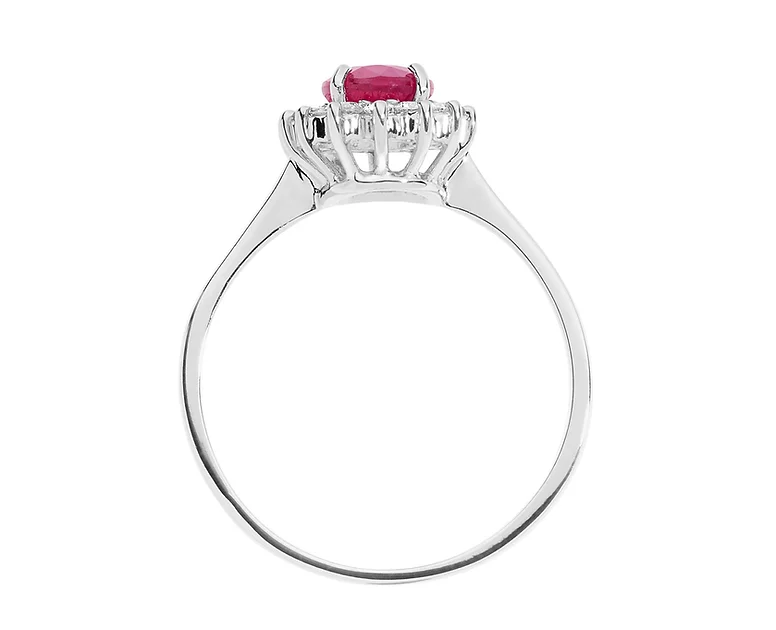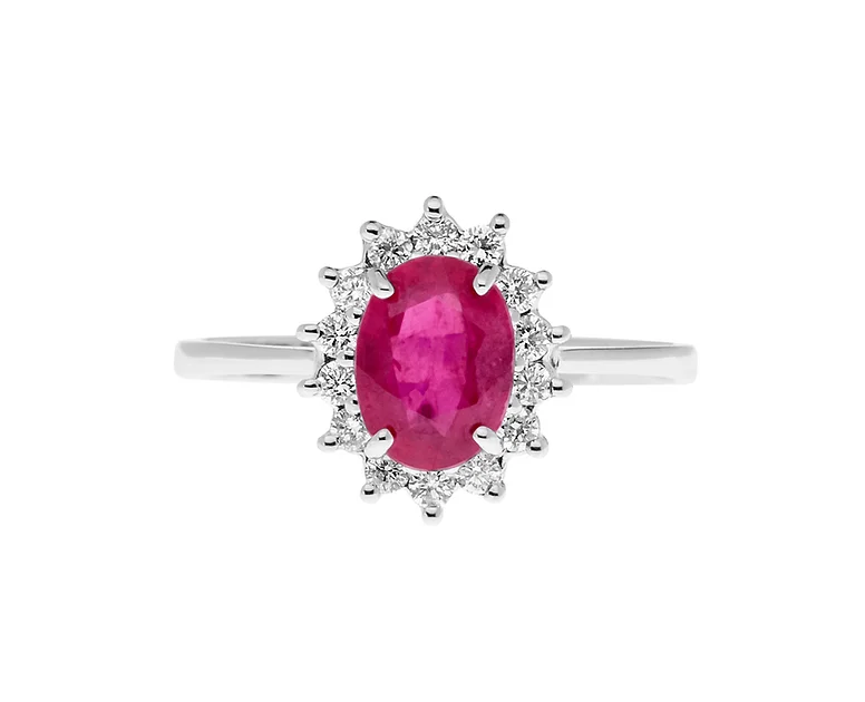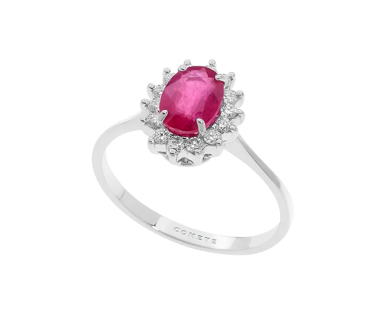 Anello della collezione ‘Regina’. E’ realizzato in oro bianco 750% con rubino ovale centrale contornato da numerosi diamanti bianchi. Motivo che ricorda le corone delle regine per esaltare la scenografia del rubino, un talismano dal colore prezioso naturale per ogni occasione