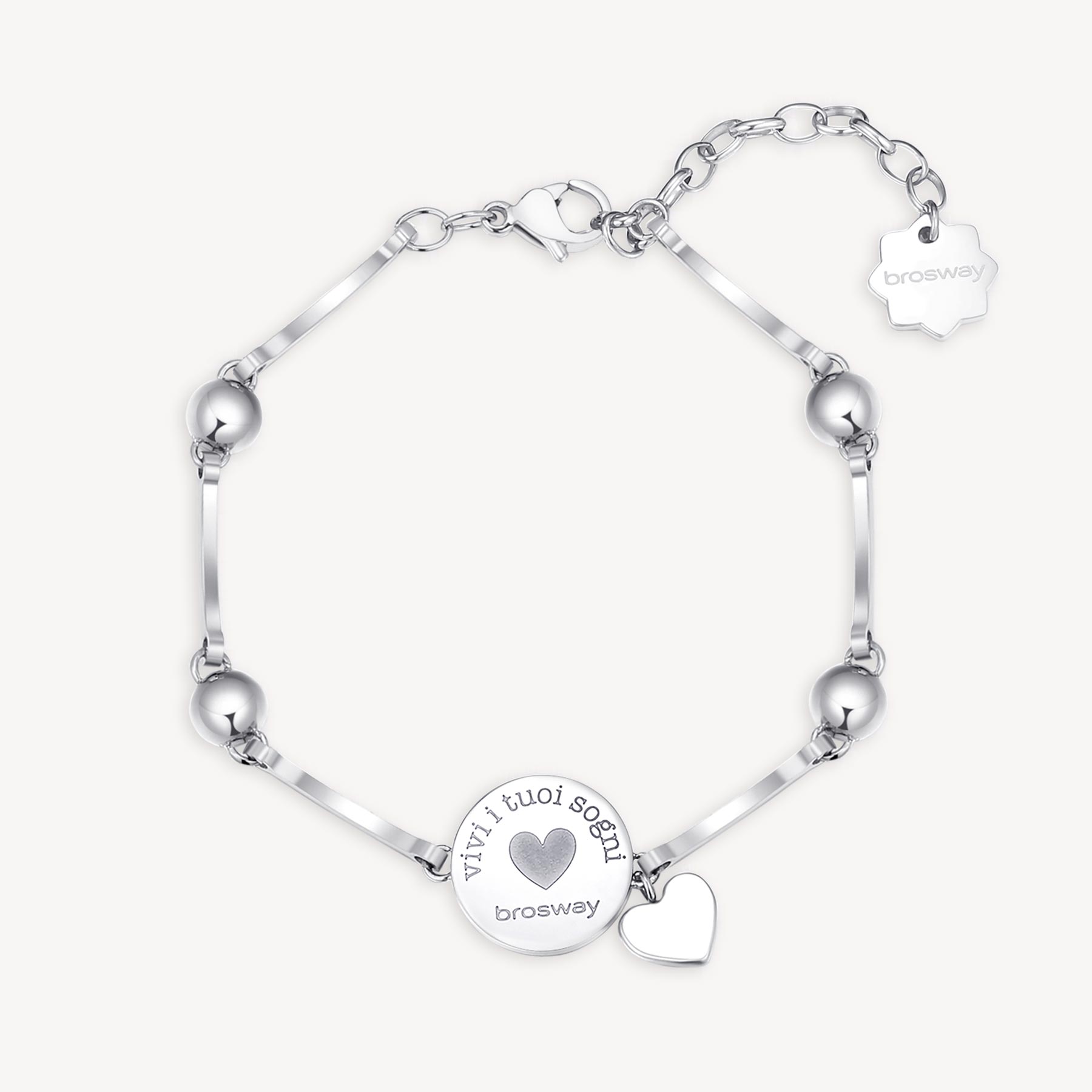 Questo bracciale della collezione Chakra di Brosway è realizzato in acciaio ed è arricchito da un motivo centrale con scritta ‘Ascolta il tuo cuore’ e cristalli bianchi. Misura regolabile grazie ad una serie di anellini terminali e chiusura a moschettone