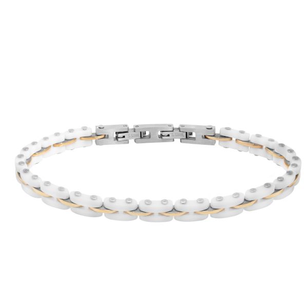 Bracciale della collezione ‘Steel collection’ di Chimiama Gioielli realizzato in acciaio e ceramica con trattamento pvd in alcune parti. Lunghezza 19.5 cm con possibilità di regolazione