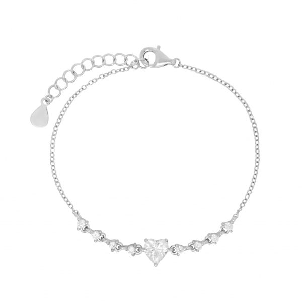 Bracciale della collezione ‘Passione zircone’ di Chimiama Gioielli realizzato in argento 925 ed arricchito da pietre bianche con cuore centrale. Chiusura a moschettone e misura regolabile grazie ad una serie di anellini terminali