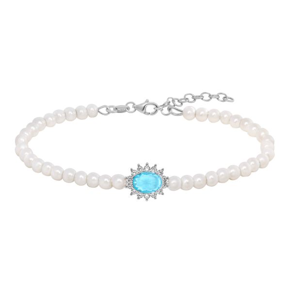 Bracciale della collezione ‘Tutti pazzi per il colore’ di Chimiama Gioielli realizzato in argento 925 e perle base vetro, arricchito da una pietra centrale di colore azzurro e zirconi bianchi. Chiusura a moschettone e misura regolabile grazie ad una serie di anellini terminali