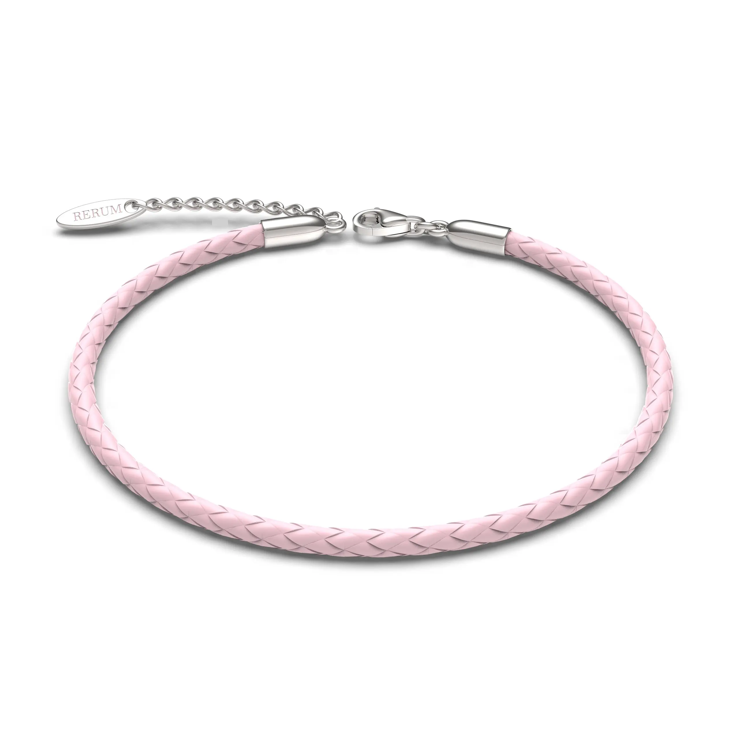 Questo bracciale della collezione Rerum Gioielli è realizzato in cuoio naturale di colore rosa e terminali in argento 925. Misura 17cm + 3cm. Chiusura a moschettone