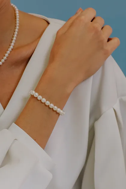 Bracciale composto da numerose perle coltivate rinfilate a nodo di diametro 6,5/7 mm. La chiusura con moschettone in oro bianco 750% rende comodo il bracciale, ideale da indossare in ogni occasione
