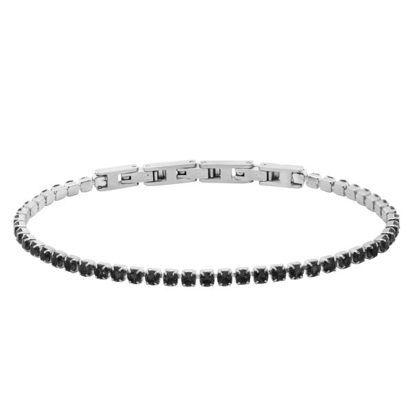 Bracciale tennis della collezione ‘Steel collection’ di Chimiama Gioielli realizzato in acciaio ed arricchito da pietre di colore nero. Misura 18 cm con possibilità di regolazione