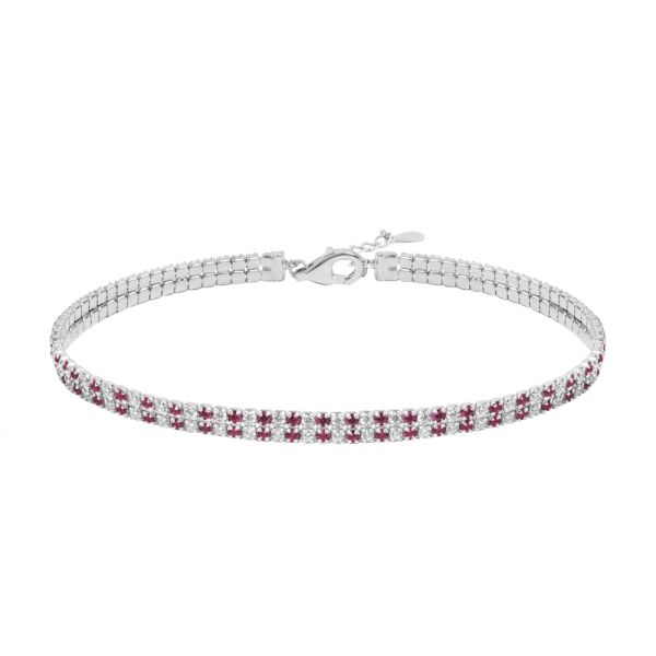 Bracciale tennis della collezione ‘Tennis lover’ di Chimiama Gioielli realizzato in argento 925 ed arricchito da pietre di colore bianco e fucsia. Chiusura a moschettone e misura regolabile grazie ad una serie di anellini terminali