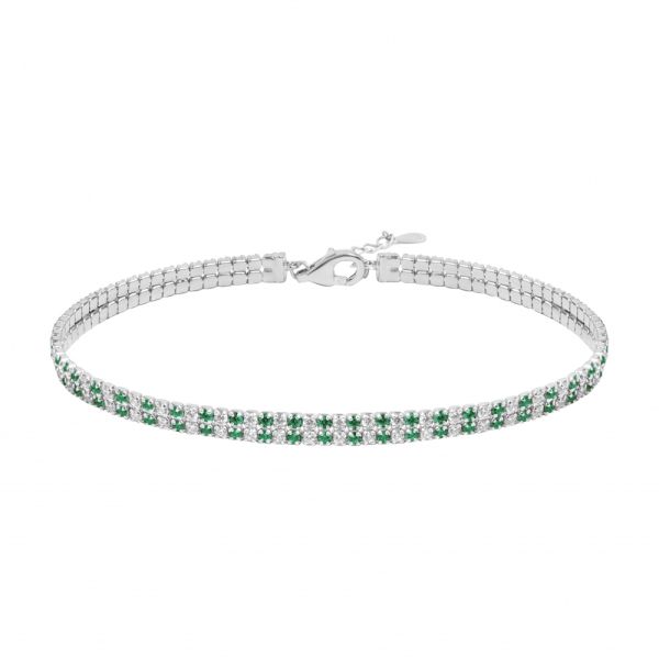 Bracciale della collezione ‘Tennis lover’ di Chimiama Gioielli realizzato in argento 925 ed arricchito da pietre di colore verde e bianco. Chiusura a moschettone e misura regolabile grazie ad una serie di anellini terminali