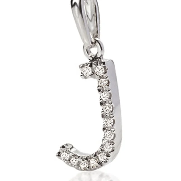 Prezioso gioiello realizzato in oro bianco 750% a forma di lettera J, la quale è impreziosita da numerosi zirconi bianchi. Ciondolo applicabile su collana o bracciale a piacimento