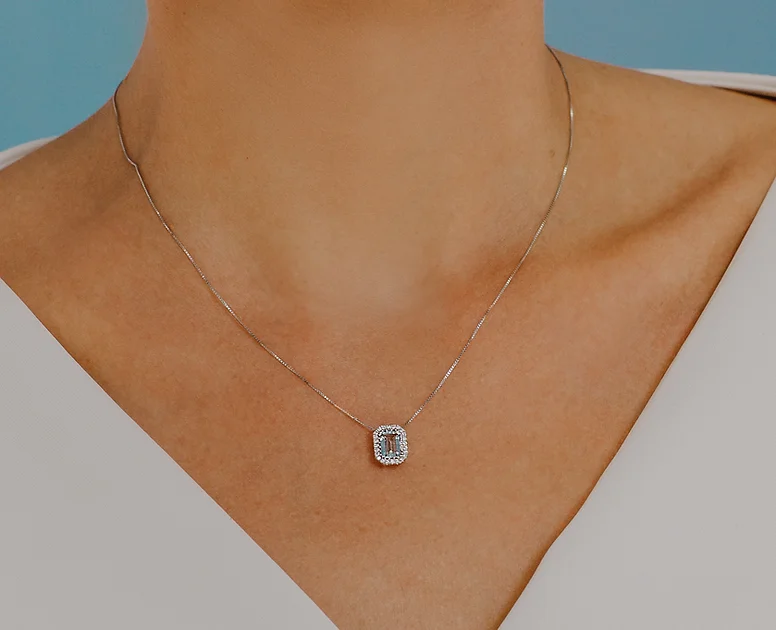 Girocollo in oro bianco 750% arricchito diamanti p.ct. 10 colore G purezza SI che contornano la pietra acquamarina prestige con taglio ottagonale 7×5 ct. 0,9