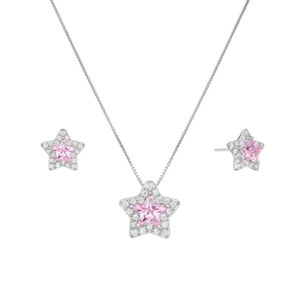 Set della collezione ‘Tutti pazzi per il colore’ di Chimiama Gioielli composto da girocollo ed orecchini realizzati in argento 925. Entrambi i pezzi sono arricchiti da stella con pietra centrale di colore rosa e contorno di zirconi bianchi. Il girocollo ha chiusura a moschettone e misura regolabile grazie ad una serie di anellini terminali. Gli orecchini, invece, presentano chiusura a farfallina