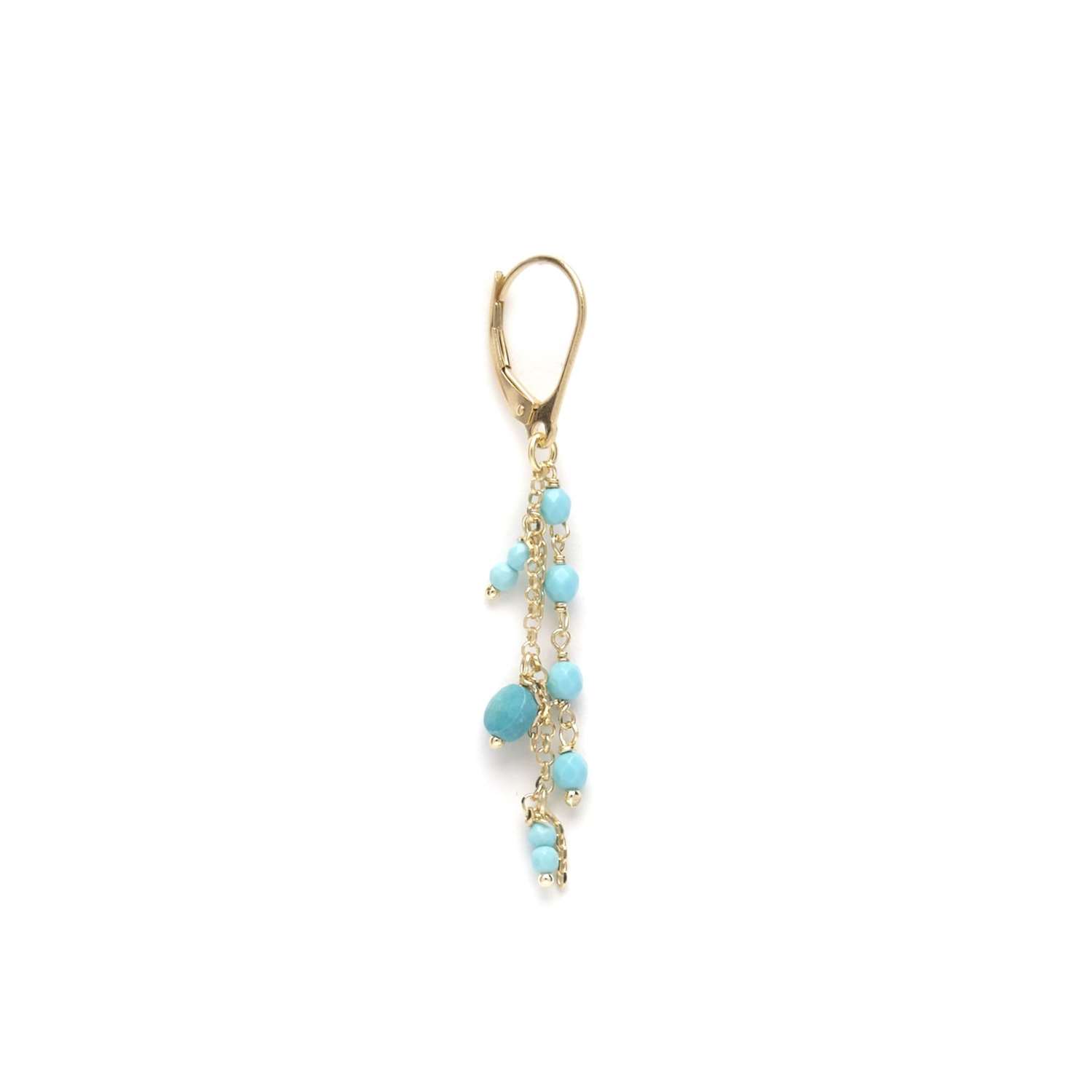Mono orecchino della collezione Passion di Io & Te Gioielli realizzato in argento 925 con placcatura in oro giallo 18 karati ed arricchito da pietre naturali turchese pendenti. Chiusura a monachella