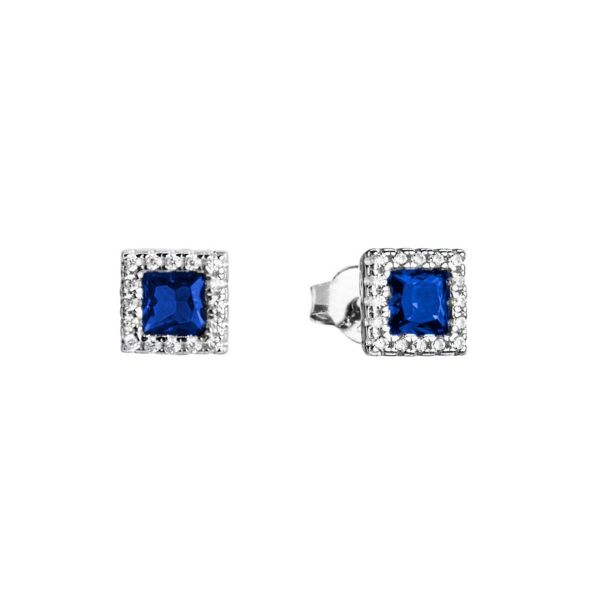 Orecchini della collezione ‘Tutti pazzi per il colore’. Realizzati in argento 925 con pietra centrale di forma quadrata di colore blu contornata da zirconi bianchi. Chiusura a farfallina
