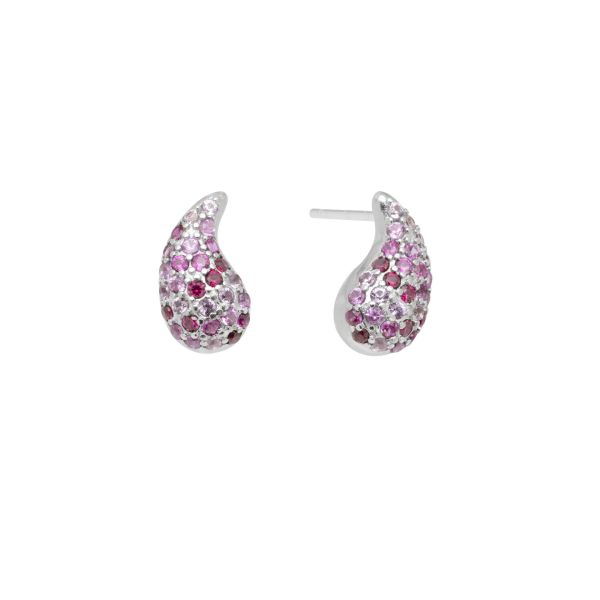 Orecchini della collezione ‘Tutti pazzi per il colore’ di Chimiama Gioielli realizzati in argento 925 a forma di goccia con pavé di zirconi di colore rosa. Chiusura a farfallina