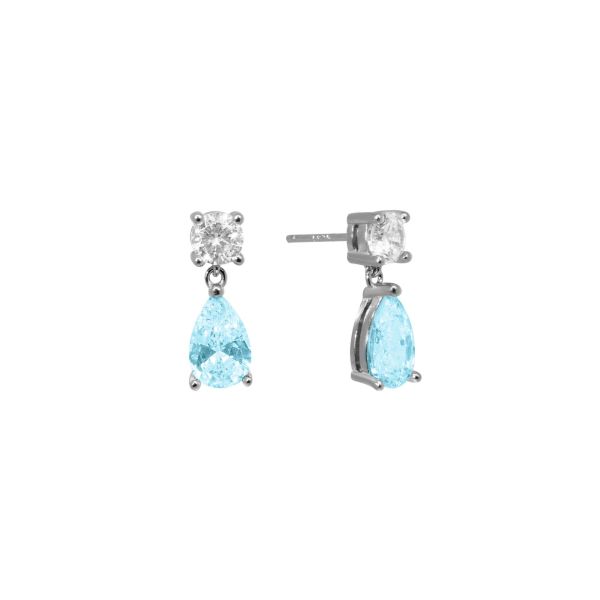 Orecchini pendenti della collezione ‘Tutti pazzi per il colore’ di Chimiama Gioielli realizzati in argento 925 ed arricchiti da zircone a forma di goccia di colore azzurro. Chiusura a farfallina