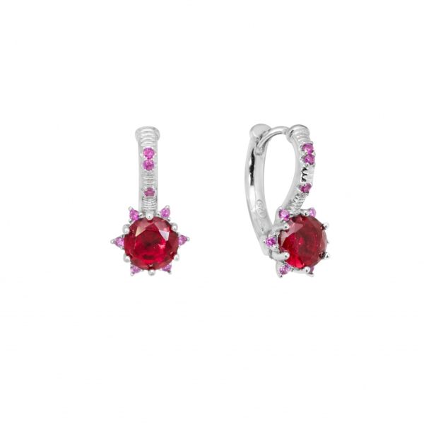 Orecchini della collezione ‘Tutti pazzi per il colore’ di Chimiama Gioielli realizzati in argento 925 ed arricchiti da pietra pendente di colore rosso. Chiusura a monachella