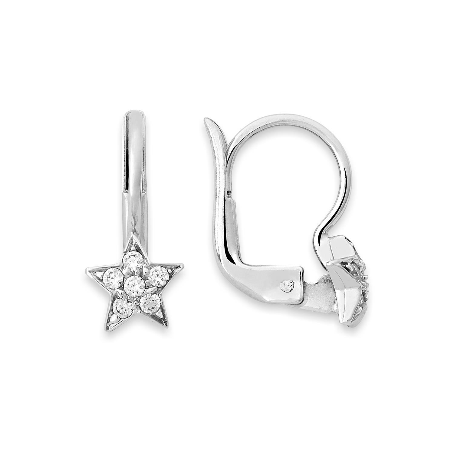Preziosi orecchini realizzati in oro bianco 750% con chiusura a monachella. I pendenti a forma di stella sono arricchiti da numerosi zirconi bianchi