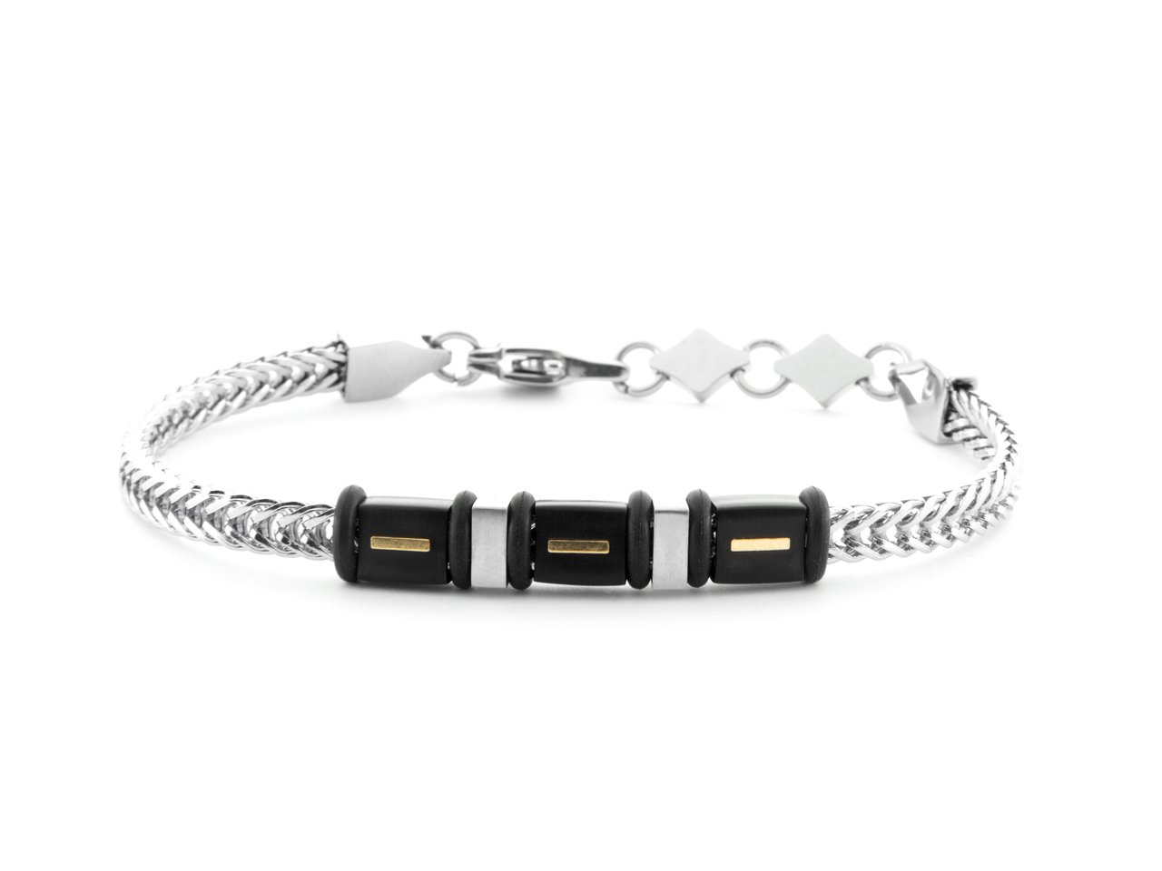 Bracciale della collezione ‘Winter’ di Cesare Paciotti realizzato in gomma ed arricchito da alcune parti in oro giallo 18 karati. Chiusura a moschettone e misura regolabile grazie ad una serie di anellini terminali