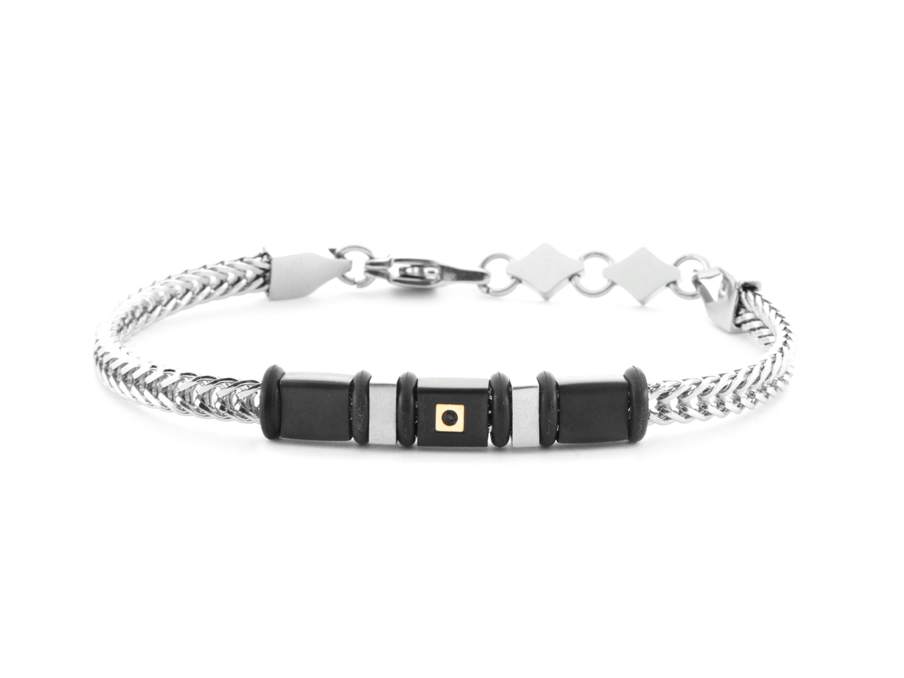 Bracciale della collezione ‘Winter’ di Cesare Paciotti realizzato in gomma ed arricchito da alcune parti in oro giallo 18 karati e spinelli neri. Misura regolabile grazie ad una serie di anellini terminali e chiusura a moschettone