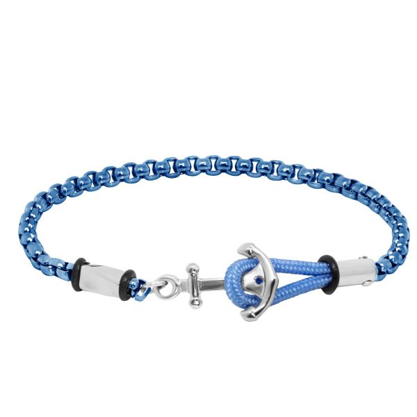 Bracciale della collezione ‘Steel collection’ di Chimiama Gioielli realizzato in acciaio ed impreziosito da trattamento pvd di colore blu e da un motivo centrale a forma di ancora. Lunghezza 20 cm