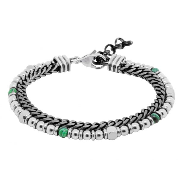 Bracciale della collezione ‘Steel collection’ di Chimiama Gioielli realizzato in acciaio ed arricchito da pietra naturale malachite. Chiusura a moschettone e misura regolabile grazie ad una serie di anellini terminali