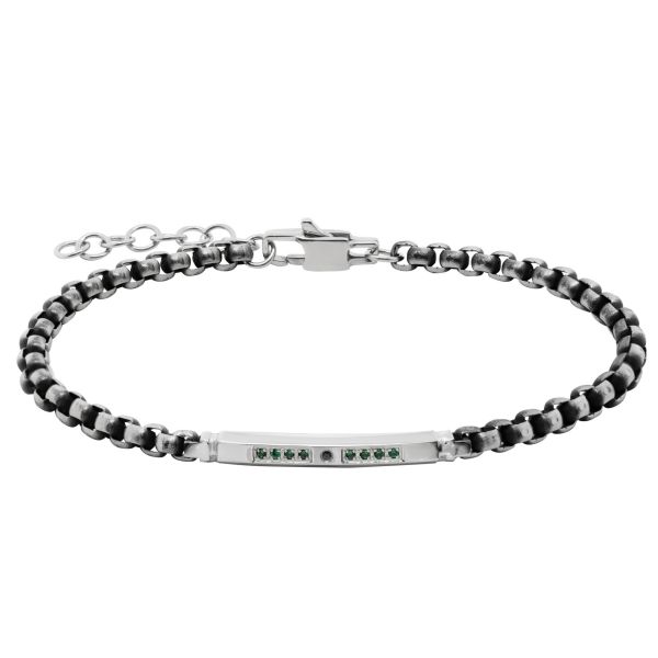Bracciale della collezione ‘Steel collection’ di Chimiama Gioielli realizzato in acciaio ed arricchito da piastrina centrale con zirconi di colore verde. Chiusura a moschettone e misura regolabile grazie ad una serie di anellini terminali