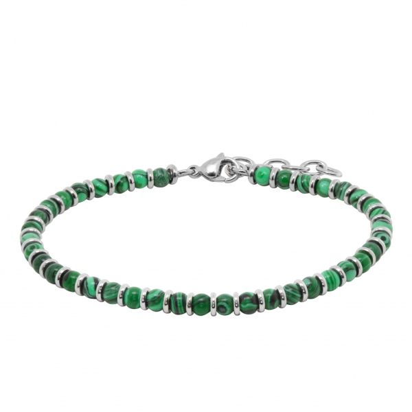 Bracciale della collezione ‘Steel collection’ di Chimiama Gioielli realizzato in acciaio ed arricchito da pietre naturali di colore verde. Chiusura a moschettone e misura regolabile grazie ad una serie di anellini terminali