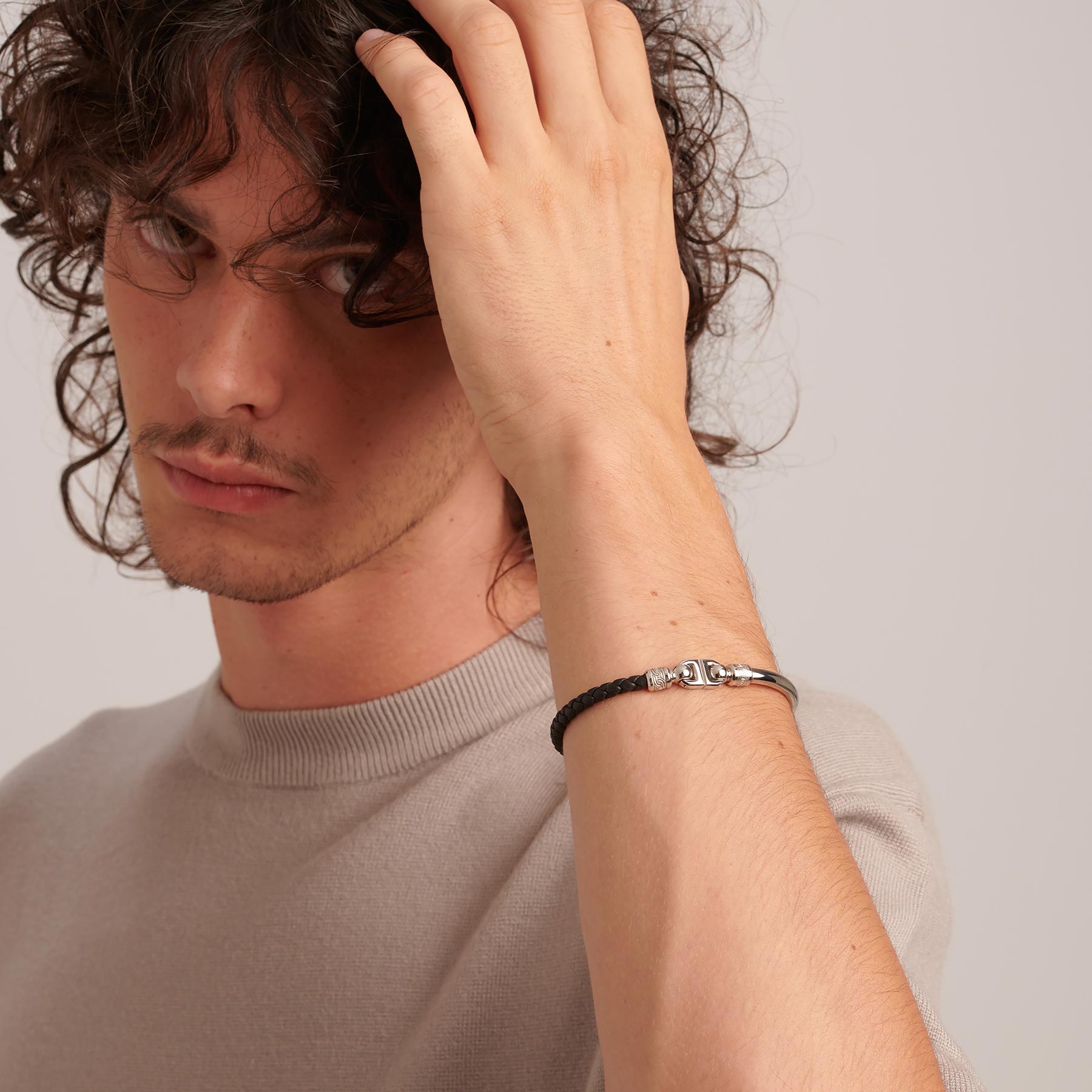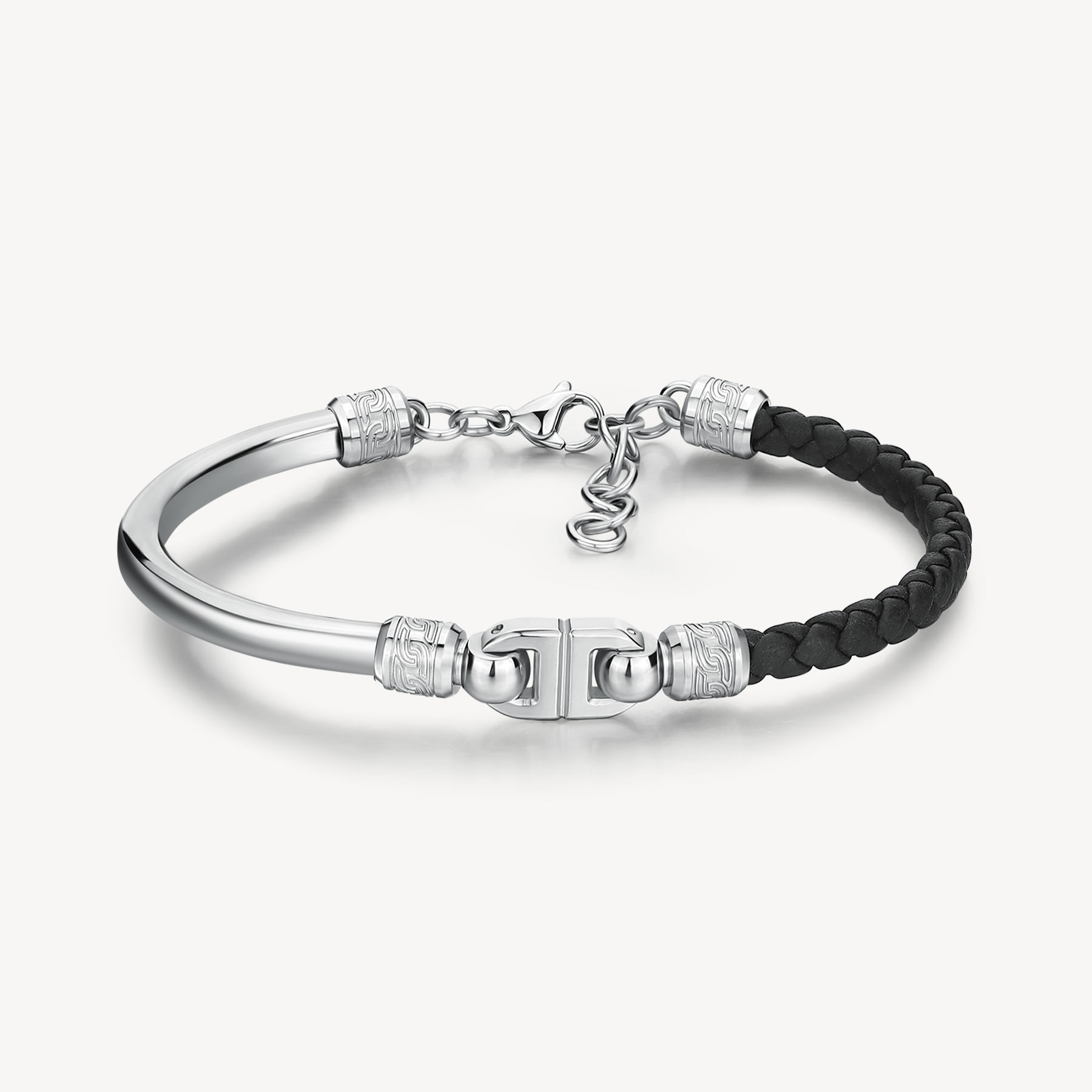 Bracciale semirigido della collezione Knocker di Brosway realizzato in acciaio e caucciù. Misura regolabile grazie ad una serie di anellini terminali e chiusura a moschettone