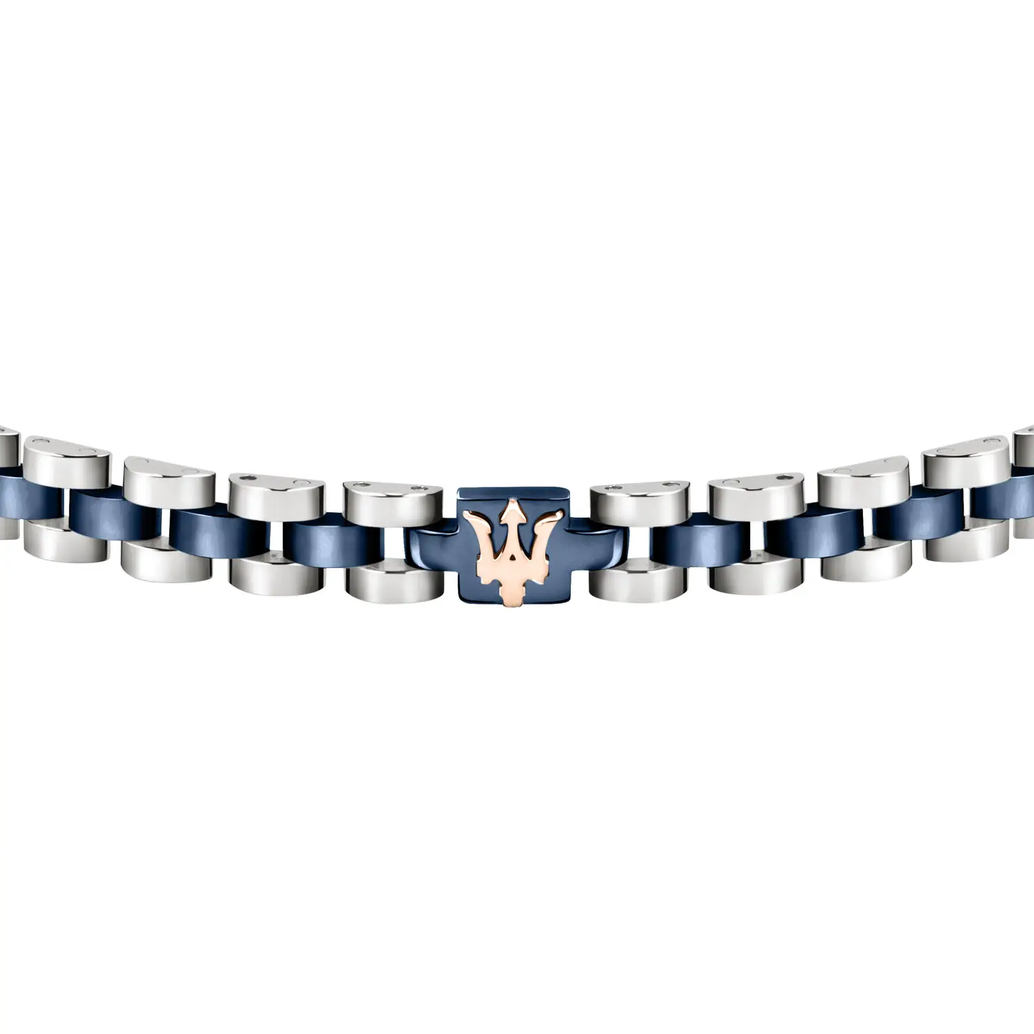 Bracciale Maserati da uomo della collezione Jewels, realizzato in acciaio con stemma Maserati sulla parte davanti. Bracciale regolabile, colore acciaio e blu. Venduto con garanzia e scatola originale