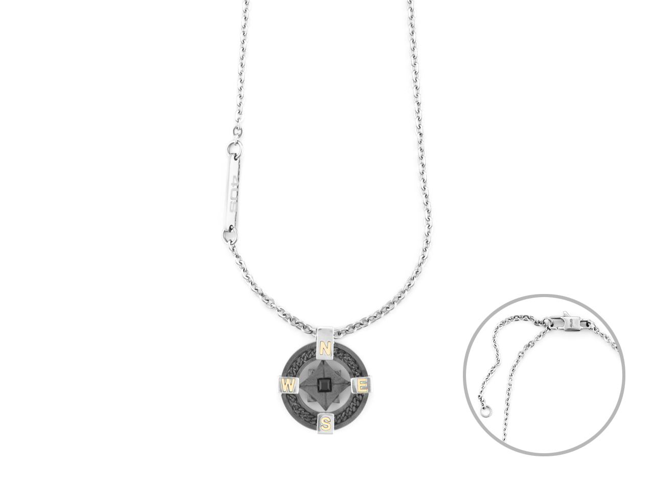 Girocollo della collezione ‘Winter’ di Cesare Paciotti realizzato in acciaio. Arricchito da pendente a forma di bussola con trattamento pvd oro nero e oro giallo 18 karati. Chiusura a moschettone e misura regolabile grazie ad anellini terminali